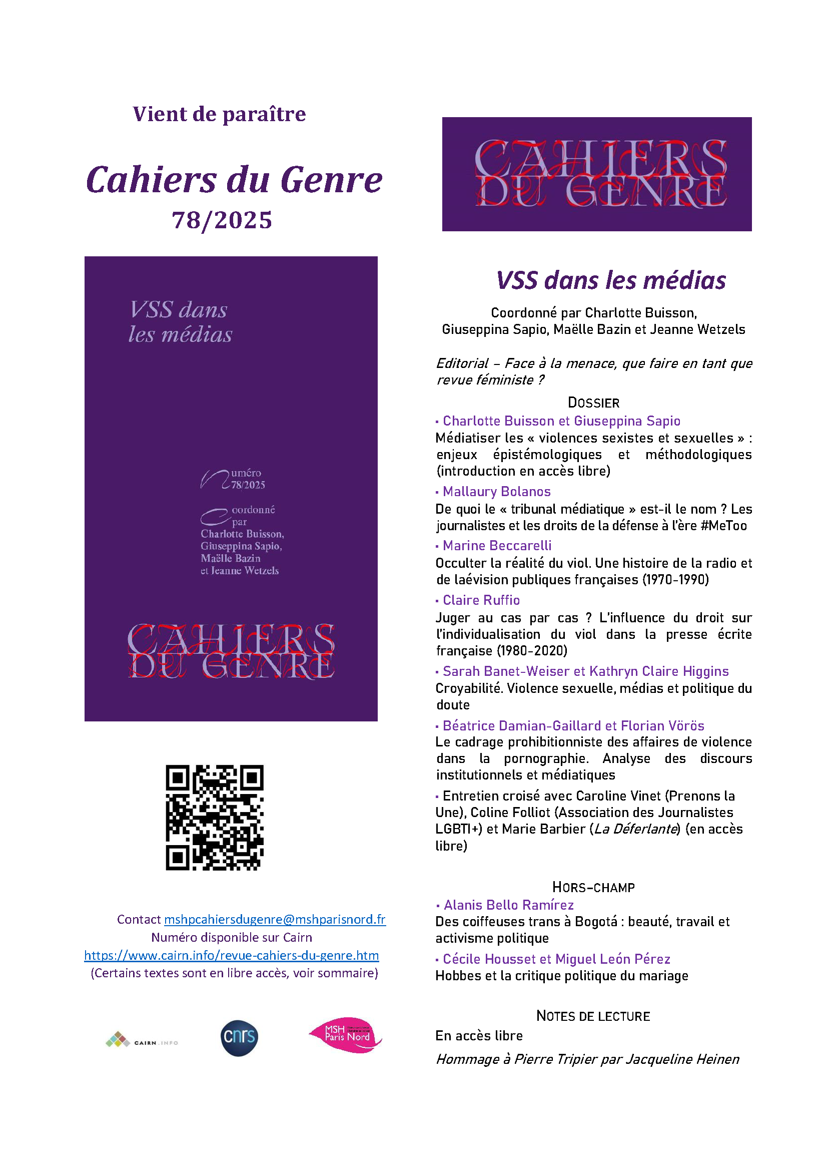 VSS dans les médias Un nouveau numéro des Cahiers du genre